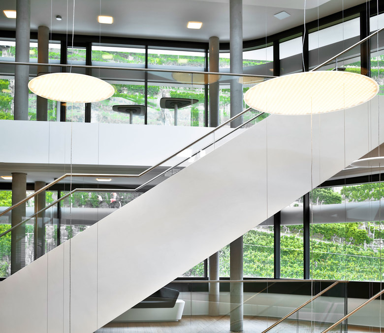 So illuminieren über die volle Höhe abgependelte, runde Scheiben der Familie Modul R Project das Atrium auf spektakuläre Weise. Auch in den wenigen Bereichen im Atrium, wo aus Akustikgründen abgehängte Decken installiert wurden, finden sich die LED-Scheiben der Reihe Modul R Project. Alle diese Leuchten arbeiten mit Lichtsensoren, die für die tageslichtabhängige Anpassung der Leuchtstärke sorgen – und zwar dezentral für einzelne Leuchtengruppen.
