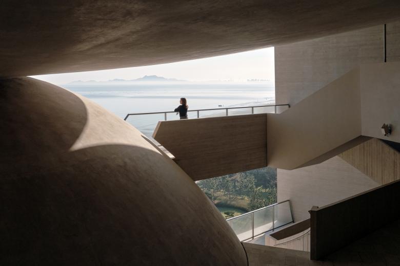 A smaller upside-down shell atop the inner shell houses the library and the Phenomena Space. The library offers both traditional and digital books. Reading under the sky and above the sea is a very unique experience. The phenomena space is a semi-outdoor void space left intentionally undefined. Its horizontal opening facing the ocean frames a spectacular view. The oculus opening at the center of the roof allows rainwater to enter and be captured by a small pool. The water in the pool swirls for 9 minutes every hour, from 5 am to 9 pm each day, working as a special time device.