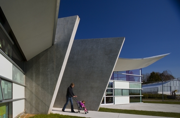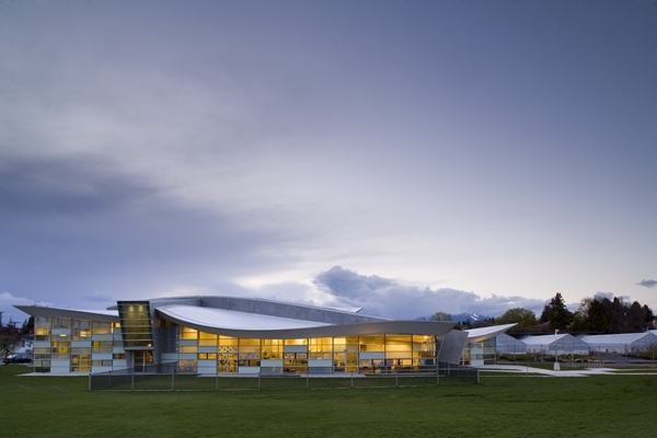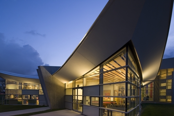 The building’s playful design stands out from its setting of subdued, modest homes, while responding to the exuberance of the neighbouring Punjabi Market. Program components achieve a distinct formal identity through five separate but harmonious undulating leaf-like roof forms that respond to the adjacent nursery. The building curves are repeated on the interior, where wood ceilings rise and fall to shape the major program areas, creating a strong connection to the exterior landscape.