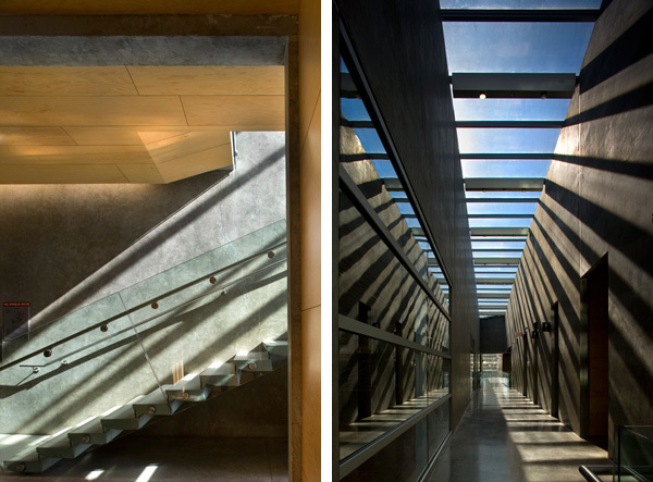 This sense of play was achieved through the creative use of three basic and economical building materials/techniques: tilt-up concrete panels, an open-web steel-joist roof system, and a glazed curtain wall system. All the earth excavated during construction was reused on site to form large rolling grassy berms. These hills form a natural outdoor amphitheatre for large summer events and festivals.