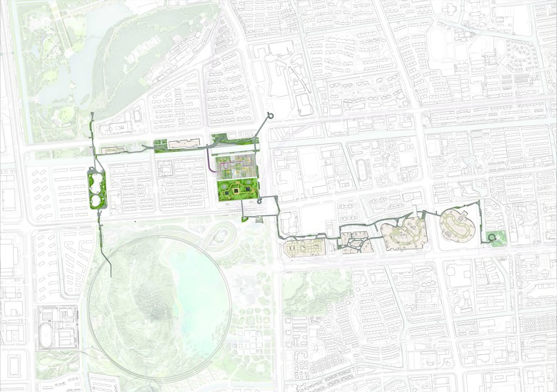 The experience of the traditional Chinese garden is unrolled and interpreted in a floating linear aggregative system of gardens and connecting lines.