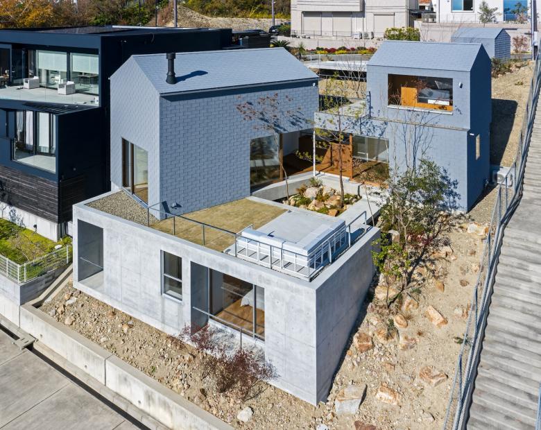 設計にあたり、これまで訪れたギリシャやモロッコ、アルジェリアの傾斜地集落も参照した。集落の魅力は、地形や給排水の与件に無理をせず、近隣住居との距離感をつくりだしていると同時に、結果的におおらかな半屋外空間が出来上がり、生活の風景を形成していることと考えている。今回の設計でも地形や友人家族の暮らし方に緻密に寄り添いながら、結果的にはおおらかな居場所が出来るように心掛けた。