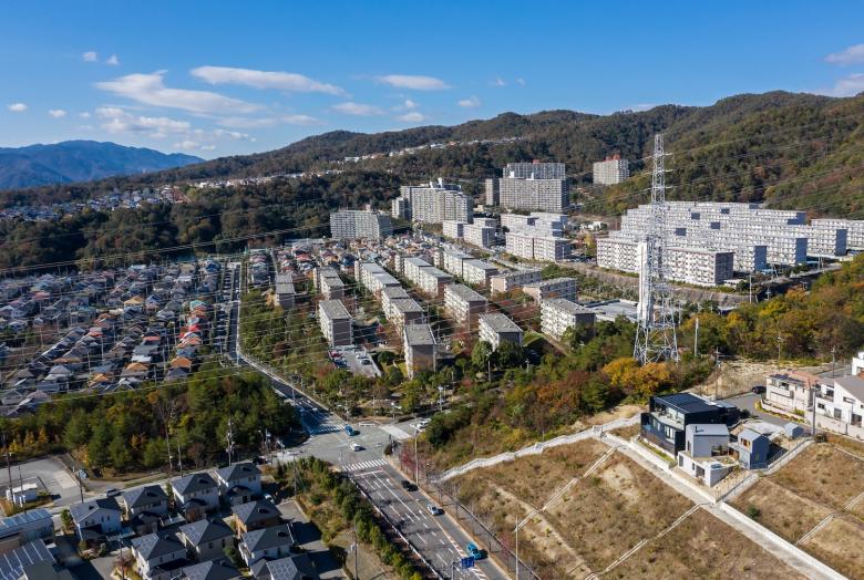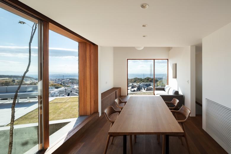 家族とアウトドアで過ごすことの多い友人が、散歩中にこの敷地を見つけた。敷地より下の傾斜地は、宝塚市が緑地としているため、大阪平野への眺望は半永久的に確保される。8.5mの高度差を持つ傾斜地(同時に北側前面道路から最高高さを3m以内にする建築協定もあった)に、子供が遊べるプライベートな庭を確保したい、という要望を組み込み、敷地全体を庭と見立てて設計がスタートした。