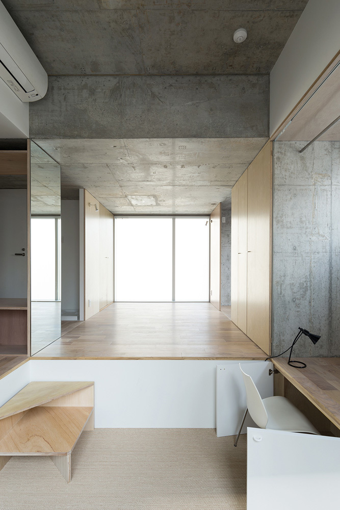 各階のくぼみの奥行きや高さを、身体的な寸法に応じて個々に解釈し、それらをキッチンカウンターやベンチ、ベッドスペース、机などとして使えるよう、仕上げによる若干の寸法調整を行った。一方で、決まった行為と1対1対応する機能空間であるより、最低限の設えを手がかりに、住み手がこれらの段差を能動的かつ発見的に使いこなすような、建物と生活の関係が望ましいと考えた。そのため、寝床にもなりそうな机や、椅子と机の中間的な高さのものが、躯体寸法から生まれるのであれば、その多義性、あるいはあいまいさをできる限り残し、そこでの居方を限定しすぎないことを心掛けた。
