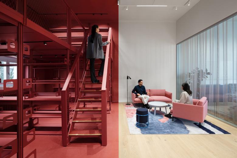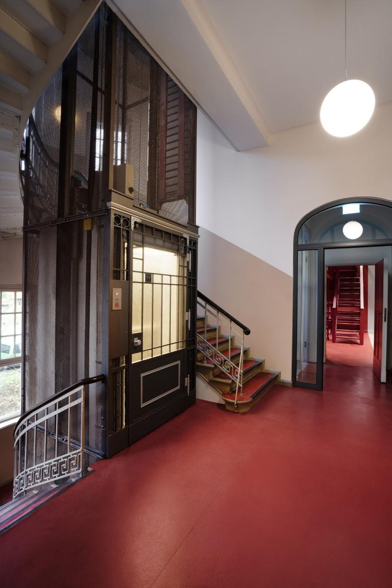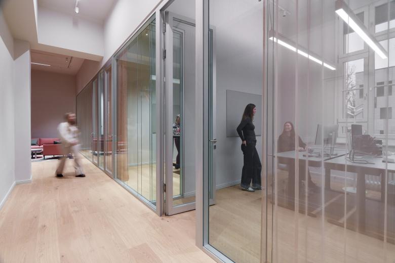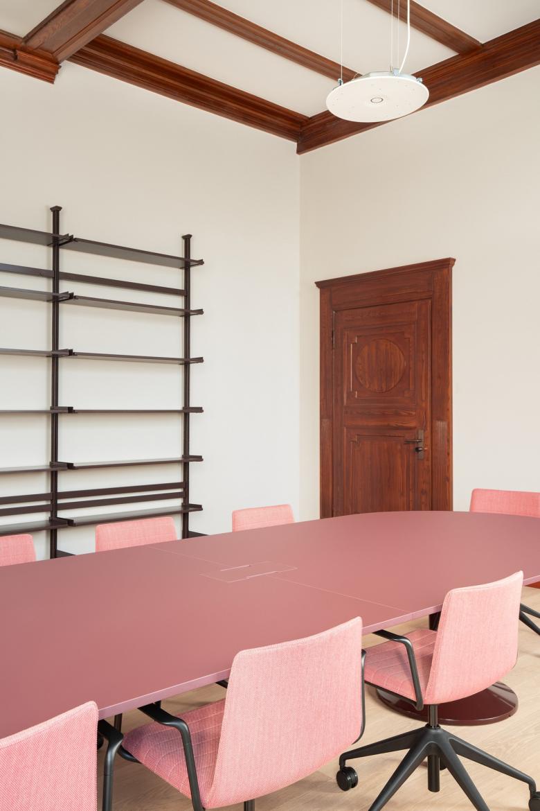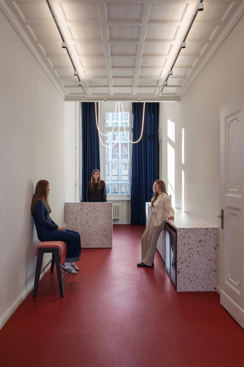 Ein fein abgestuftes Rot zieht sich wie ein visueller Puls durch die Fläche. Es steht für Energie, Lebendigkeit und Wandel – und macht spürbar, was die Stiftung Deutsches Herzzentrum antreibt. Historische Elemente wurden behutsam freigelegt und mit zeitgemäßen Materialien kombiniert. Das alte Archivregal bleibt – neu interpretiert als Statement für Kontinuität. Ein Begrünungskonzept von P2 Objektgrün sorgt für lebendige Akzente.