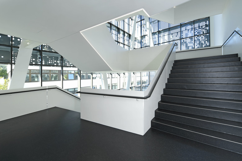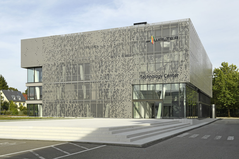 Das äußere Erscheinungsbild wird geprägt durch die gelochte Metallfassade, die den optischen Bezug zum High-Tech-Unternehmen herstellt.