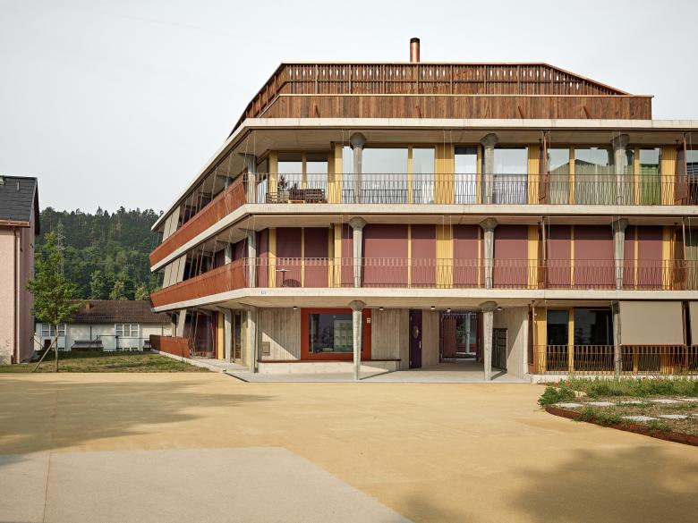 Unweit des Ortskerns auf einem Wiesenplateau lag eine angejahrte Wohnsiedlung. Gleich unterhalb fehlte es dem Altersheim an Praxisräumen. Die Idee einer Kollaboration und Nachverdichtung keimte auf, um so den Bestand sinnvoll zu ergänzen und Synergien zu schaffen. Nur punktuelle Eingriffe sollten möglichst wenig Abbruch verursachen. Neu ersetzt ein kompaktes Hofhaus in Holzbauweise zwei Bauten und forstet den Bestand mit Kleinwohnungen auf. Sein prägnantes Exoskelett aus Betonpfeilern bietet aussen- wie hofseitig eine breite Schulter und Schutzschicht an. Es steht ganz im Zeichen evidenter Gemeinschaft und Wohnlichkeit.