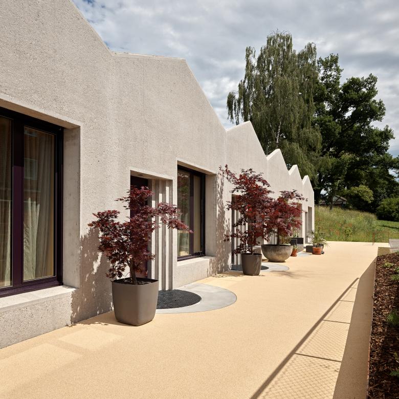 Zum Altersheim hin überraschen Atelierhäuser, die sich in die Böschung schmiegen. Vier sind zur Arztpraxis vereint, in dreien lässt sich wohnen oder arbeiten. Auch ihr Innenleben ist detailreich, Oberlichter verströmen eine fast sakrale Anmutung. Einen schönen Empfang beschert nun der Bestand: Pergolen rahmen die Eingänge, die in die Fassade integrierten Sitzbänke sind Einladung und Puffer. Die Öffnungen darüber wurden zu Erker-, Sitz- oder Hochfenstern umgedeutet und die Steildächer zu gemütvollen Maisonettes ausgebaut. Eine Verdichtung erfolgte auch stadträumlich, verschiedene Zugänge, Zonen und Pflanzgärten als Bindeglieder initiieren Begegnung und verschleifen Altes mit Neuem. (mc)