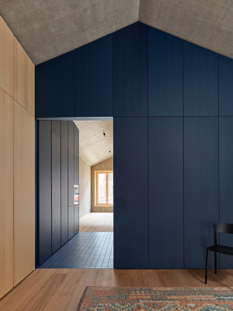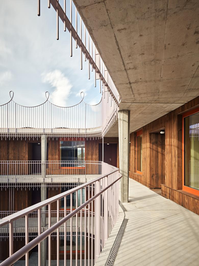 41 Wohnungen und Gemeinschaftsräume wie Waschsalon, Bibliothek oder Fitnesstempel fächern sich um einen Hof, verbunden durch begegnungsfördernde Laubenringe und filigrane Rankgerüste. Selbst das Dach ist Ort des Zusammentreffens mit Grill und Terrasse. In den Innenräumen herrscht lustvolle, von Holzflächen dominierte Material- und Detailvielfalt. Sie bilden nicht nur Wände, sondern teils gar Möbel aus: etwa in der Küche, wo sich aus Sitzfensternischen das Hofleben beobachten lässt. Im Rückwärtigen steigt der Grad der Intimität, bis sich ein Wohnraum vollverglast nach aussen spreizt. Alle Einheiten sind mit der Sorgfalt eines Möbelbauers und als Rundgang angelegt – die atmosphärische Dichte will auch den Flächenkonsum eindämmen!