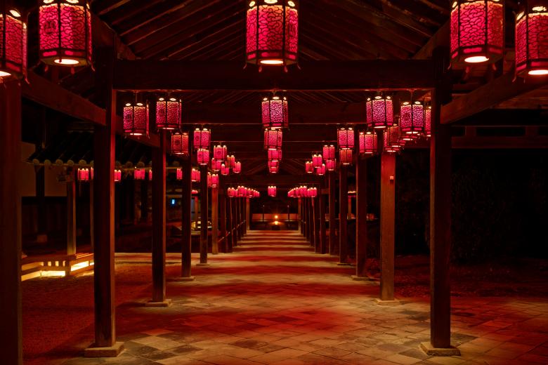 Überdachte Hauptwege werden von 570 Laternen in rotes Licht getaucht, das das Element Feuer symbolisiert.