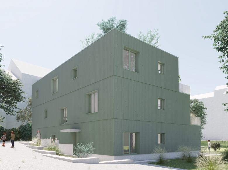 In Leipzig-Schleußig entsteht auf einem rückwärtigen Grundstück ein Mehrfamilienhaus in ökologischer Holzbauweise. Das Konzept vereint hochwertigen Wohnraum mit zusätzlichen Mieteinheiten für generationenübergreifendes Wohnen. Der Baukörper öffnet sich nach Südwesten mit großzügigen Fenster- und Terrassenflächen und nutzt so den Bezug zu Licht und Natur optimal. Die grün lasierte Holzfassade fügt sich harmonisch in den begrünten Innenhof ein und betont den nachhaltigen Anspruch des Projekts.
