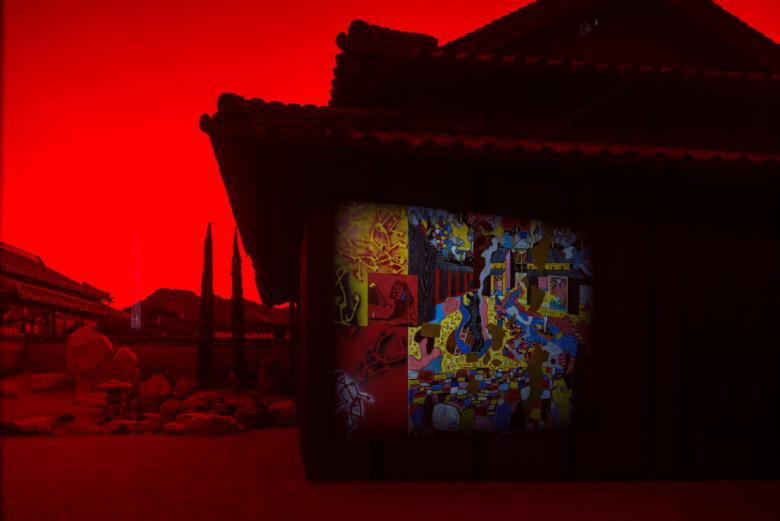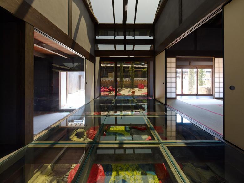 2013年の瀬戸内国際芸術祭、夏会期に開館した瀬戸内海豊島の港町家浦の集落の中にある横尾忠則氏の美術館。古民家3棟のリノベーションと一部増築から成る。非日常空間と日常空間が隣り合う特徴的な敷地であった。この美術館で目指したのは建築と作品が一体となった空間。建築という3次元表現を絵画的な2次元表現に近づける事を考えた。色彩情報を消す赤ガラス、明度をコントロールする黒ガラス、反射面としての効果を持つガラスなど様々なスクリーンによって空間の中に2次元的なシーンが生まれる。赤ガラスは美術館のテーマである、“生と死”、隣り合う“日常と非日常”の境界としてある。片方の世界からもう一方の世界を見た時、風景はモノクロに展開する。横尾作品である庭の赤い石も消える。横尾作品のコラージュのように、作品とスクリーンによって生まれたシーンが3次元的空間の中で一体となっている。シーンは人の動き、太陽の光の状態で刻一刻と変化する。一度として同じシーンの組み合わせはない。“生と死”は横尾忠則作品の根底にあるテーマであり、私たちの日常の中に流れる共通のテーマでもある。常に変化し、循環し続けるシーンの集合体として豊島横尾館を考えた。