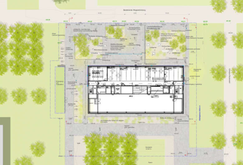 Mit der Verwendung von Kalksplitt aus weißem Jura der Schwäbischen Alb und Steinbänken aus Gauinger Travertin vom nahegelegenen Steinbruch übernehmen wir die regionale Materialität im Projekt. Mit großflächig verwendetem wasserdurchlässigem Rasenfugenpflaster wird der Versiegelungsgrad der Freianlagen auf ein Mindestmaß reduziert und so ein möglichst hoher Versickerungsgrad des Oberflächenwassers erreicht.