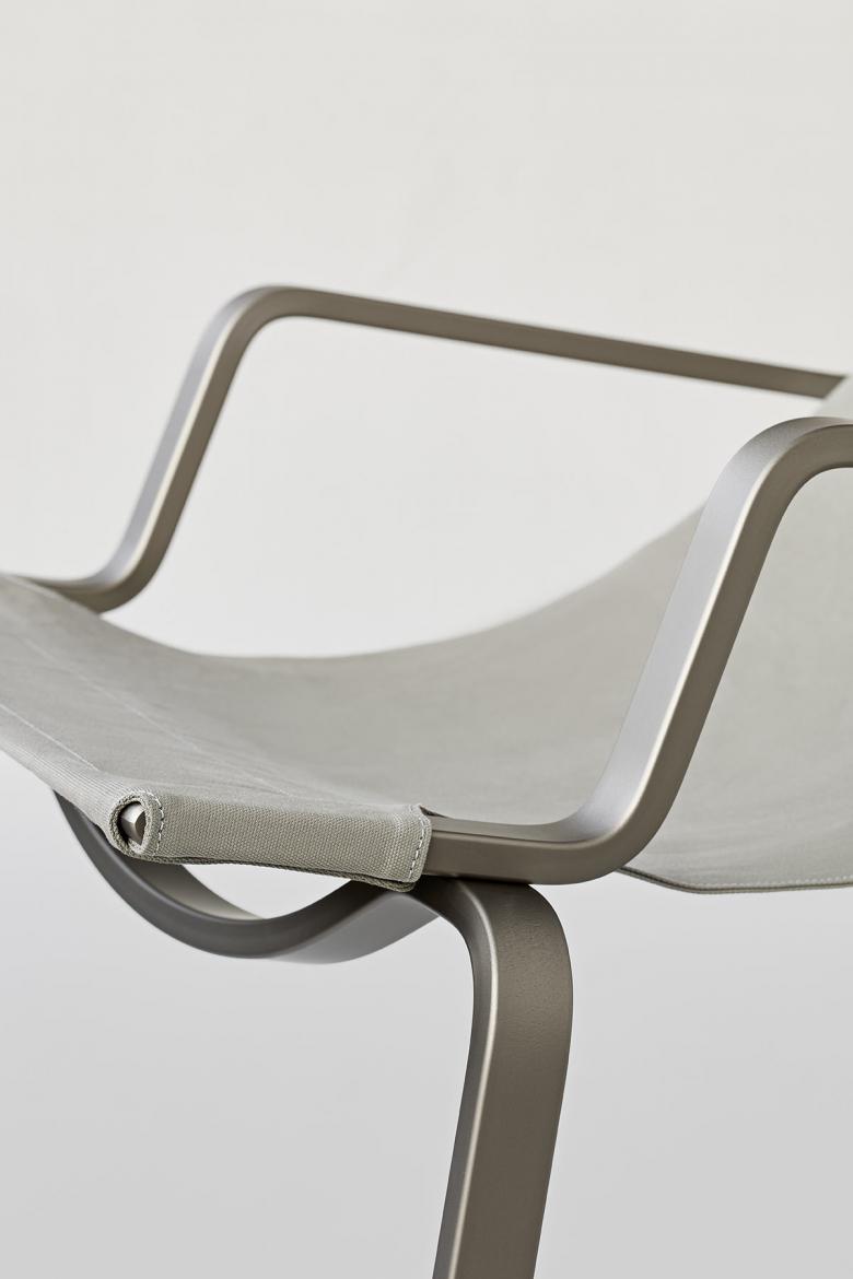 Der leichte Sessel ist stapelbar und eignet sich für den Aussen- wie den Innenbereich. Die Aluprofile sind farblos, bronze oder schwarz eloxiert zu haben, die Sitzbezüge in den Farben Limestone, Gravel und Schwarz, was insgesamt neun verschiedene Kombinationsmöglichkeiten ergibt.