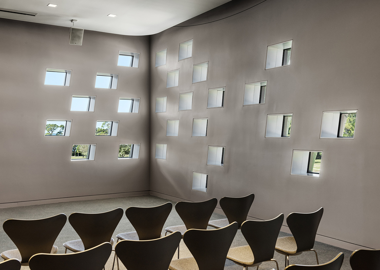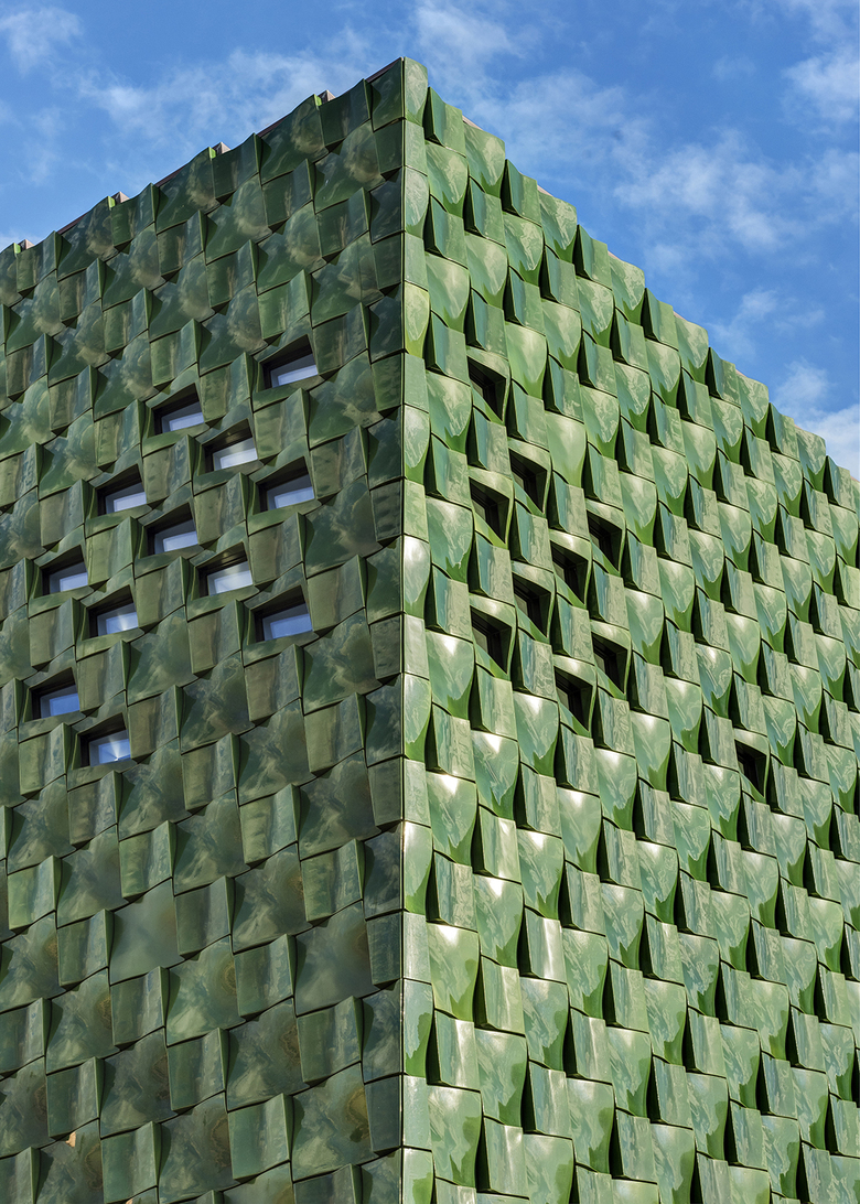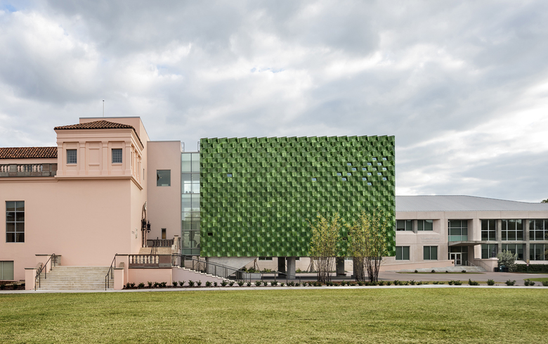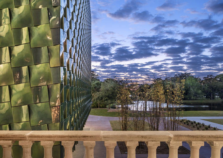 The addition’s façade is composed of deep-green, glazed terra cotta tiles that address the client’s requirement of a new monumental entrance. The façade relates to the natural environment of the Museum’s extensive landscape, and its color and chiseled profile are reminiscent of the Cà d’Zan mansion’s ceramic detailing. Machado Silvetti collaborated closely with Boston Valley Terra Cotta to develop the color, form and installation technique for the panels. The over 3,000 tiles provide a high performance, visually striking building envelope that redefines the functionality of the surrounding site by activating the existing courtyard and by addressing circulation and infrastructure needs of the site.