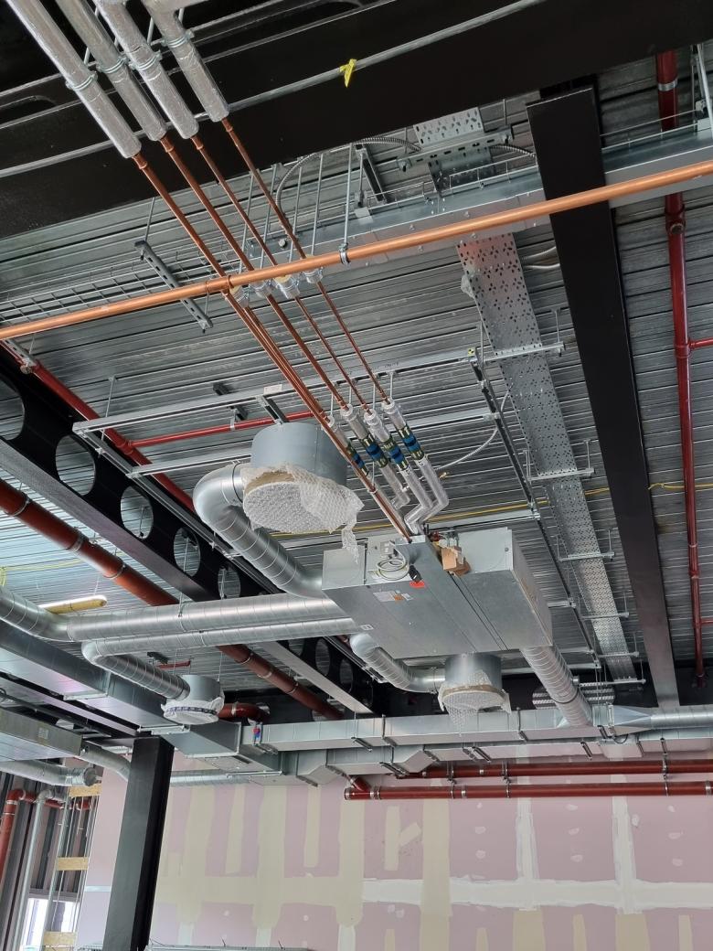 Bereits vor Baubeginn wurden beteiligte Zulieferer und Spezialisten, wie Kiefer frühzeitig in die Planung eingebunden und arbeiteten direkt mit Landsec und Bryden Wood zusammen. Denn auch die Installation der Versorgungsleitungen ist optimiert: Die Leitungen sollten so wenig Platz wie möglich beanspruchen und so viel wie möglich sollte auch hier standardisiert werden. Die Planung sah eine freie Sichtmontage ohne abgehängte Decken vor. Um diese Projektanforderungen bestens erfüllen zu können, führte Kiefer vorab realitätsnahe Versuche im hauseigenen Labor durch. Hierfür wurde ein typischer Büroraum mit dem Decken-Luftdurchlass INDUDRALL KR 500 ausgestattet, um so das Luftströmungsverhalten für die drei Lastszenarien Vollkühlung, Teillastkühlung und Vollheizung zu untersuchen. Kiefer konnte mit diesen Versuchen zeigen, dass auch unter den projektspezifischen Vorgaben eine ideale Raumluftströmung erreicht wird und alle Komfortbedingungen eingehalten werden. Die Laborversuche ergaben auch, dass geplante Leuchten und Akustikpaneele den Luftstrom nicht beeinflussen. Durch eine projektspezifische Anpassung und eine optimierte Anordnung der Drallelemente kann sogar eine höhere Induktion und eine gute Strahlerzeugung erreicht werden. Dies verbessert den thermischen Komfort für die Nutzer deutlich.