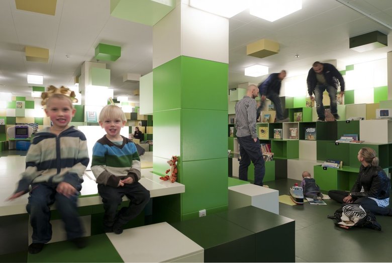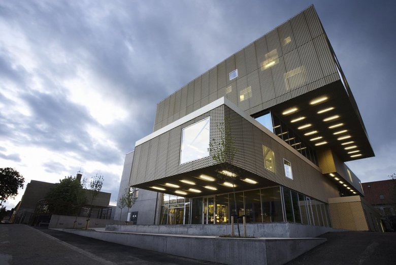 The new culture house consists of four clearly defined programs: a children’s library, a youth library, a library for adults and a concert hall. These four functions are stacked on top of each other like a series of golden “books”. Each "book" is a world of its own with individual interiors and furnishment. The spaces between the books are open zones for flexible use. This gives a varied coherence between open and closed spaces. The open spaces are marked by the immediate context and the closed areas as completely choreographed places.