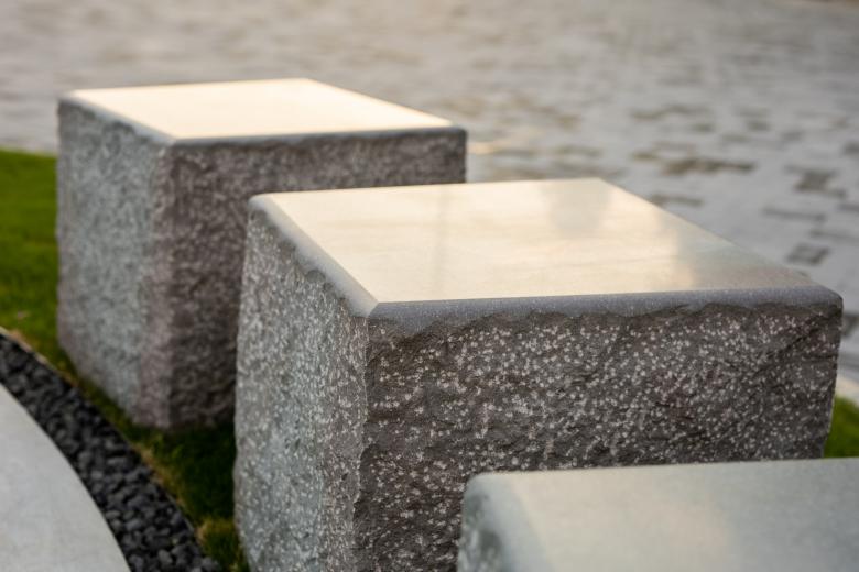 The images of the golden-rayed lilies representing the facility blossom white against the black of the same granite as the water mirror. The flowers are engraved using the shot-blast method.
