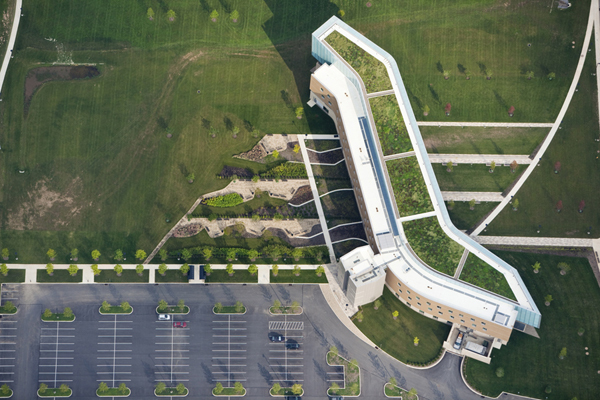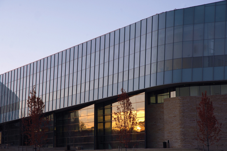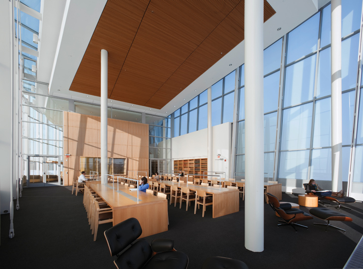 The building’s sinuous form is a direct response to the agrarian site, the geology of the valley and the presence of the surrounding mountains. Central to the design is the idea that the law library is the theoretical and physical heart of the legal educational experience, the center in which students spend much of their time. The ground plane flows unimpeded, linking interior and exterior space and fostering a feeling of openness and accessibility. Clad in glass, the curving volume creates a constantly changing backdrop of reflected sunlight throughout the day and a beacon of light at night. Within, the library is conceived as a continuous looping circulation system, providing different types of study environments. The building is designed to be LEED certified. Sustainable design features include the abundance of natural day lighting in the building’s public spaces and a continuous planted green roof.