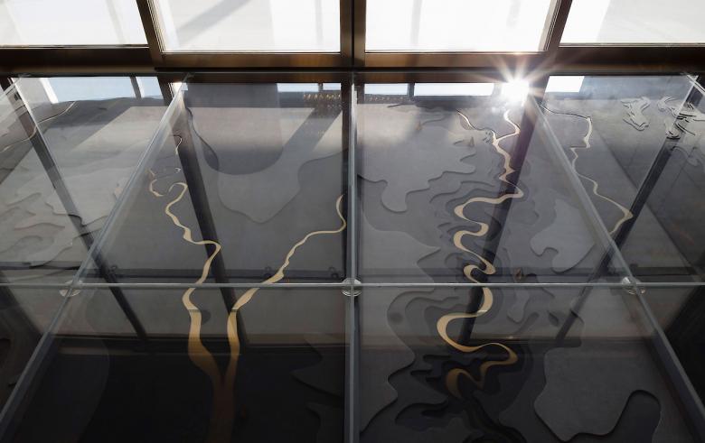 酒窖的玻璃地面下方是六大葡萄酒产地的抽象地图装置,并带有自动感应灯光。叠术建筑事务所设计装置时,运用了混泥土作为地图地貌,河流则用不锈钢材料诠释。酒架材料为不锈钢,巧妙的亚克力底座设计,可以有多种不同的酒瓶储放方式。酒瓶既可以平叠摆放,也可以倾斜摆放。与此同时,亚克力底座设计也完美地优化了酒窖内部的光线分布。