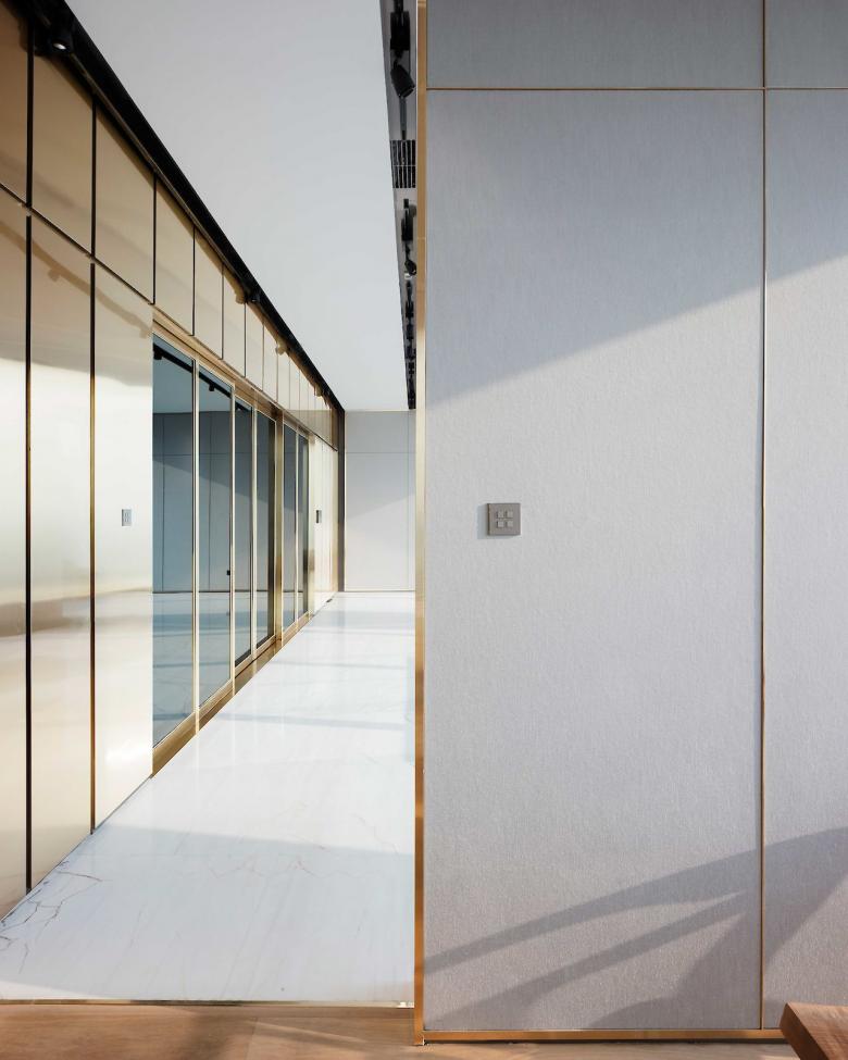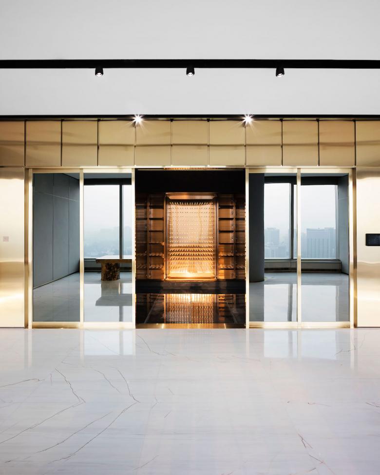 会所除了用作于会员的活动地点,也用来储放与消费昂贵红酒和茶叶收藏。整个空间被分割为两个完全不相同的世界:办公区域和私人会所。会员从隐蔽的旋转门进入到会所内,一览北京的使馆区和金融区。金色不锈钢元素巧妙地反射了天际线,自然地形成了整个会员俱乐部的背景。
