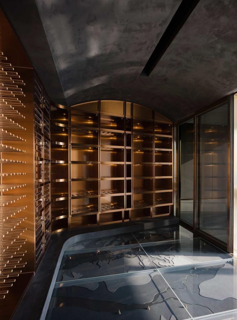 中央分隔体的一部分是由深色的镜面玻璃制成,玻璃的镜面映射着城市轮廓,而把“空中酒窖”隐藏在另一面。“空中酒窖”的设计是对传统酒窖的重新诠释。会员通过自动平开玻璃门进入隐藏的私人酒窖。酒窖面积25平米,可储藏500瓶红酒,红酒来自波尔多,罗讷河谷,勃艮第,纳帕,摩泽尔和巴罗洛这六个世界知名的红酒产区。白天,镜面玻璃门将酒窖隐藏起来,并保护其中的红酒免受阳光直射。镜面门使会员在酒窖内的同时也能观赏到城市风景。夜幕降临后,酒窖灯光开启,500瓶红酒在主体空间中显露出来。