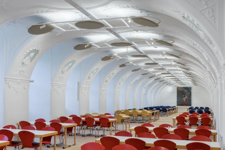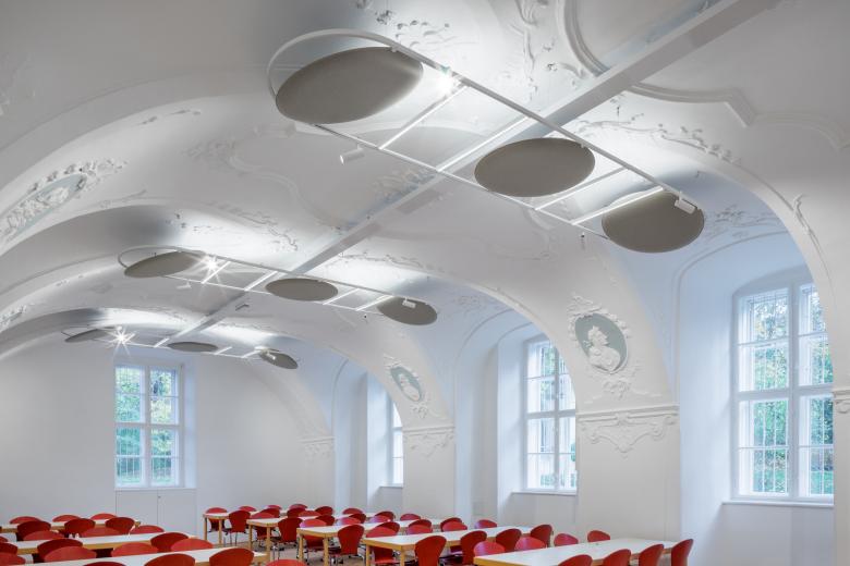 Der große Speisesaal wurde im 17. Jhdt. errichtet und beeindruckt mit seiner Architektur und den aus dem 18. Jhdt. stammenden gerahmten Porträtköpfe. Mit seinen ca. 180 Sitzplätzen finden Kinder vom Kindergarten, der Volkschule, des Gymnasiums und des Internats Platz. Aufgrund der Raumgeometrie (ca. 42 M lang, ca. 6,7 M breit, ca. 4,5 M hoch, Gewölbe) ist die Bauakustik sehr ungünstig (langer Nachhall). Mit den eingesetzten Leuchten mit den Akustikelementen konnte der Nachhall deutlich reduziert werden, und die Bauakustik verbessert werden. Die Leuchten sind in jeder Fensterachse, deren Stichkappengewölbe mit dem Hauptgewölbe ein Kreuzgewölbe ausbilden, angeordnet. Eine Leuchte in einer Fensterachse besteht aus Insgesamt 4 direkt/indirekt Lichtbändern, 4 Spots und 3 Akustikelementen. Insgesamt sind 14 Leuchten über die ganze Saallänge angeordnet.