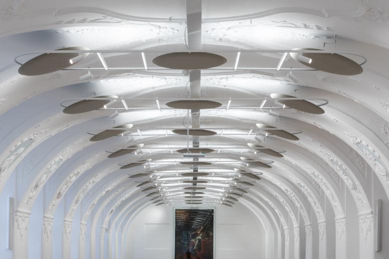 Die Spots beleuchten den Stuck und die Reliefmedaillons in den Gewölbeflächen.