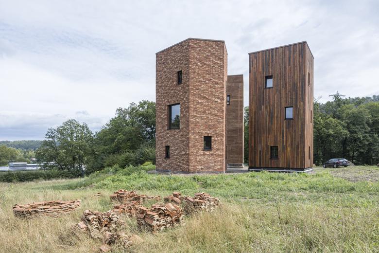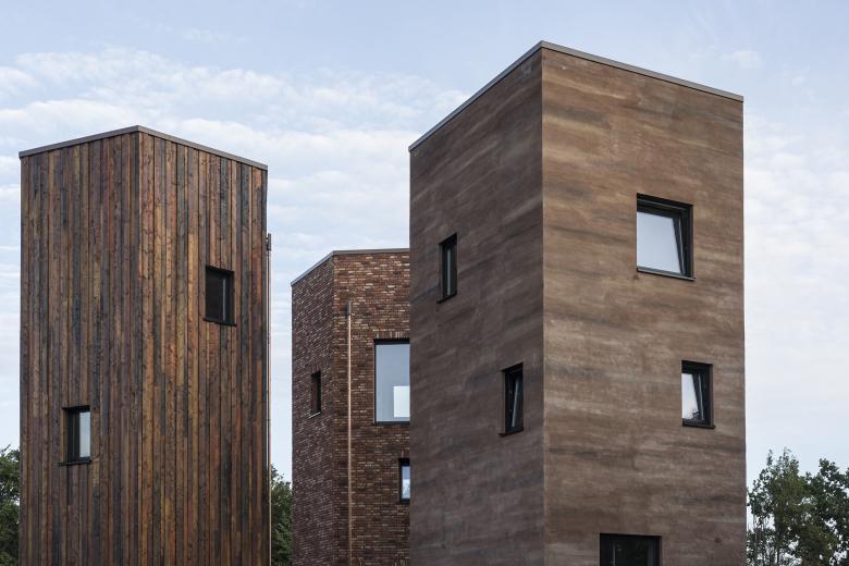 The internal supporting structure is crafted from a wooden framework sourced from local woodlands, ensuring a connection to the surrounding environment. The facades are clad in materials salvaged from other construction sites items that would otherwise have been discarded including reddish clinker bricks, larch boards of varying thicknesses, and clay-lime plaster. This resourceful approach not only minimizes waste but also emphasizes the aesthetic potential of repurposed materials, giving the building its distinctive and sustainable character.