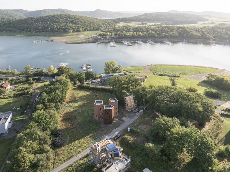 The Three Columns are situated on the Ways of Life campus by Lake Edersee, Germany, serving as a central element of the community. These structures house a series of rooms tailored for creatives, artists, architects, and students, featuring ateliers and communal spaces designed to foster collaboration and innovation.