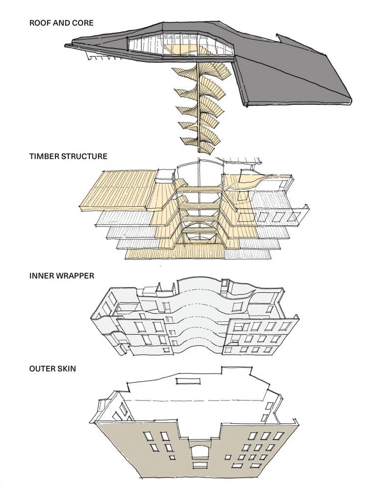 Employing a parametric and holistic design approach, the new mass timber architecture seamlessly integrates with the existing structure. Inserted in the center of the house is a spiral stair, which symbolizes a tree growing through the space and culminating in a wide-branching roof canopy.