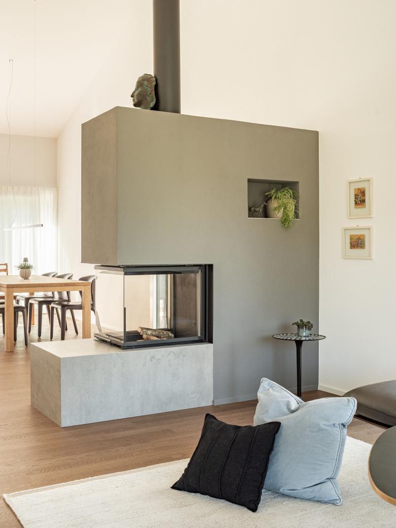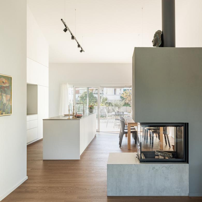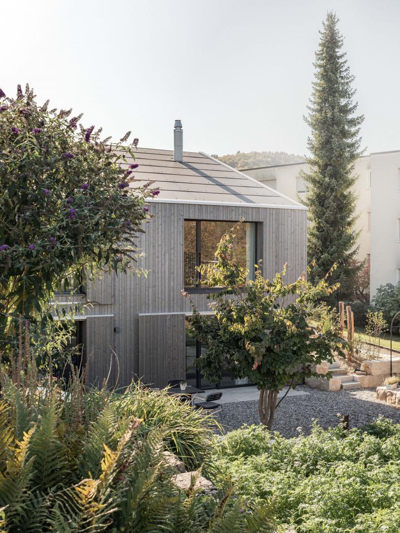 So verschmilzt Architektur mit Natur, Mensch mit Raum. Die klare Form öffnet sich nach innen und außen, ohne sich aufzudrängen. Das kleine Haus tritt leise auf – und fügt sich dabei auf erstaunlich selbstverständliche Weise in das historische Dorfbild und die Nachbarschaft ein.