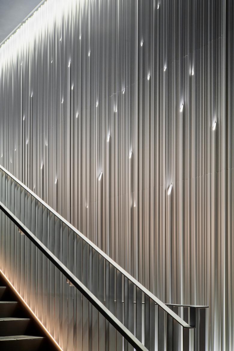 足元は青海波のパターンを組み合わせ、レースのようなアルミキャストによる、透けるファサードとした。手がけた内装部分であるバーを含む1Fエントランス空間、そして劇場ホワイエも水のイメージの派生表現となっている。