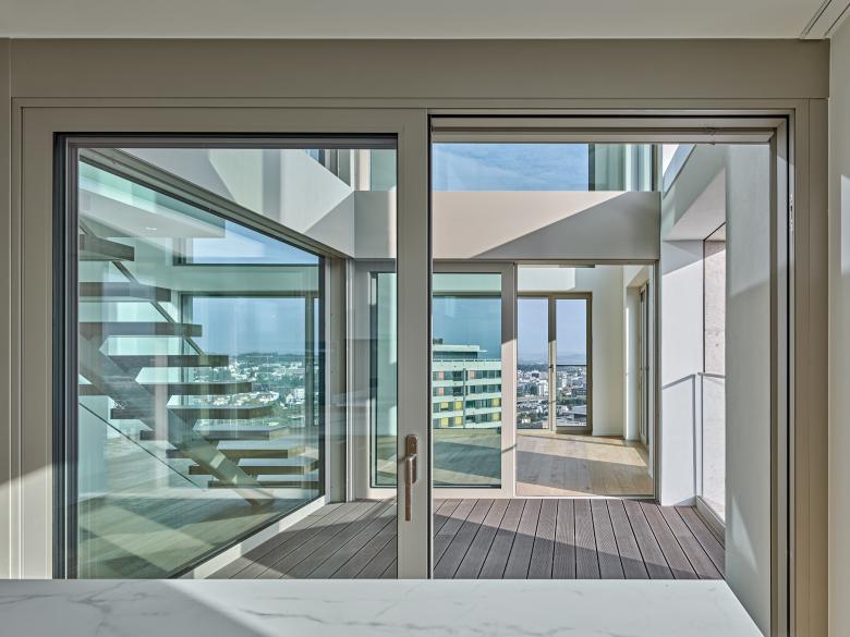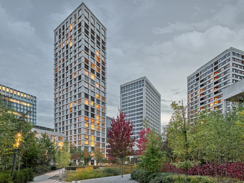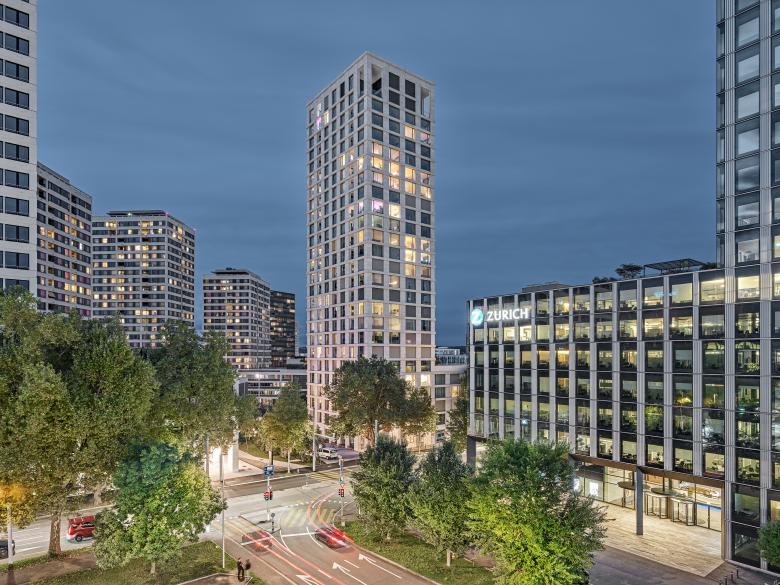 Nicht nur mit dem benachbarten Wolkenwerk-Ensemble befindet sich der 80-Meter-Turm in guter Gesellschaft. Zusammen mit dem «Sky-Key» vis-à-vis formuliert er eine Torsituation. Darüber hinaus besitzt er das nötige Gewicht, um selbst mit den Hochhäusern am Quadroplatz auf Augenhöhe zu kommunizieren. Überhaupt schliesst das Hochhaus nicht einfach nur eine Lücke, sondern ist auch eine einladende Geste: Unterstützt von einer 90 Grad-Drehung Richtung «Leutschenbach Kopf», verweist seine Hauptfassade auf den «Inneren Garten», der so einen prominenten Auftakt erhält.