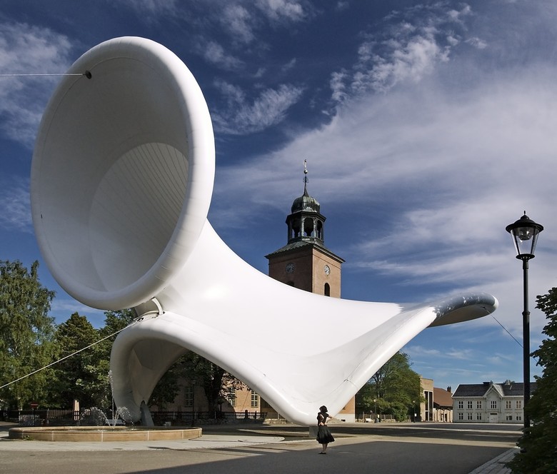 Snøhetta designed the Tuballoon to serve as the main stage at Scandinavia’s reputable Kongsberg Jazz Festival. The annual musical event is one of the oldest and most highly regarded festivals in Europe, headlining acts from the international jazz scene. The mounting of Tuballoon recurs annually and stands for three weeks time before returning to storage in standard containers for the rest of the year. The pneumatic tension membrane structure measures 20 meters in height and approx. 40 meters in length. The structure seems poised to break away and drift skyward from the tethers which hold fast to its historic site. Its geometry is suggestive of natural acoustic forms such as musical wind instruments and geometries of the inner ear.