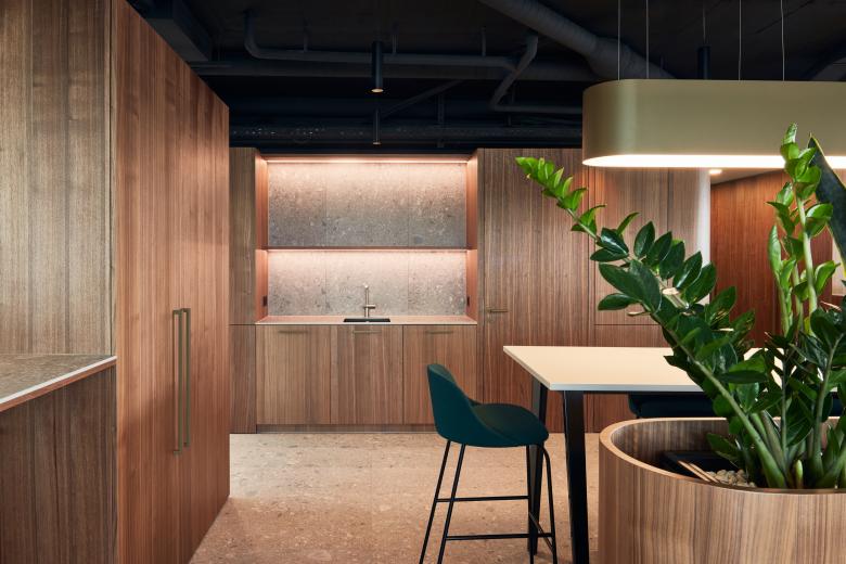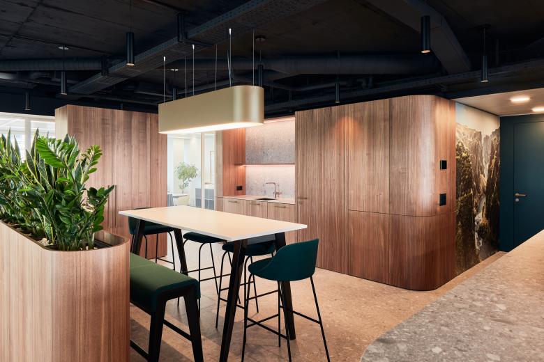 Der multifunktionale Raum dient als flexibler Knotenpunkt, der Kommunikation, Zusammenarbeit und kurze Aufenthalte fördert. Durch eine klare räumliche Struktur wird die zentrale Rolle des Bereichs innerhalb des Büros betont, während gleichzeitig eine offene und einladende Atmosphäre geschaffen wird. Dieses Konzept verbindet moderne Arbeitsanforderungen mit einer inspirierenden Umgebung.