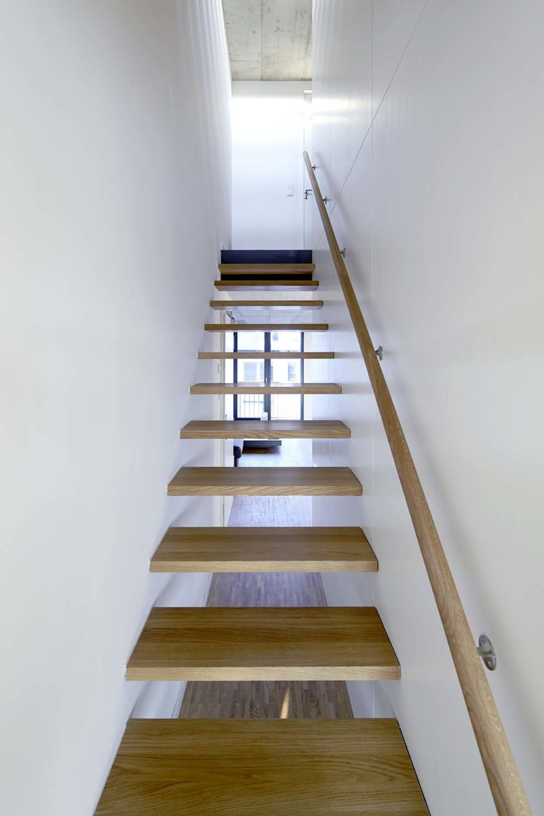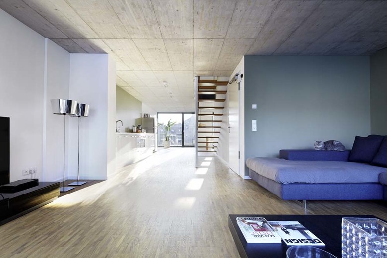 Nachverdichtung – Auf das bestehende 3-geschossige Gebäude werden 3 weitere Geschosse gebaut. Großzügige Öffnungen und die freien Grundrisse ermöglichen ein Durchwohnen zwischen Straße und Innenhof. Glatte, weiße Wände, sichtbare Betondecken, Estrich- und Holzfußböden und ein optimierter Energiestandard sorgen für eine behagliche und effiziente Wohnsituation.