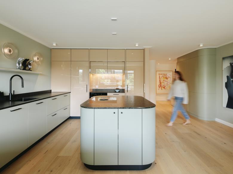 Die Küche strahlt mit ihren klaren Linien, cremefarbenen Fronten und einer dunklen Arbeitsfläche sowohl Funktionalität als auch Ästhetik aus. Glänzende und matte Oberflächen spielen bewusst miteinander. Indirekte Beleuchtung hebt die geometrischen Formen subtil hervor und sorgt für ein angenehmes Raumgefühl. Der offene Wohnbereich verbindet Küche, Esszimmer und Wohnzimmer zu einer Einheit. Diese großzügige Struktur fördert nicht nur den Dialog zwischen den Bereichen, sondern bietet auch die Flexibilität, den Raum sowohl für gesellige Anlässe als auch für ruhige Stunden zu nutzen. Die zurückhaltende Möblierung ergänzt das minimalistische Konzept und sorgt für eine zeitlose Atmosphäre. Die Formensprache mit den gerundeten Ecken macht aus Kücheninsel, Küchentisch und der klassischen Eckbank maßgefertigte Designermöbel.