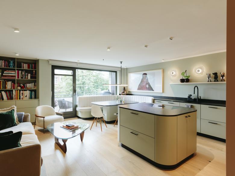 Der Eingangsbereich, akzentuiert durch ein abgerundetes Einbaumöbel samt Sitzbank, empfängt die Bewohner mit einer gelungenen Balance aus Funktionalität und künstlerischem Anspruch. Die Möbelstücke setzen mit ihrer geschwungenen Formensprache einen subtilen, aber markanten Akzent, der sich nahtlos in das Gesamtkonzept der Wohnung einfügt. Sie verkörpern die Verbindung von Ästhetik und Pragmatik und bilden einen einladenden Auftakt in die neu gestalteten Räume. Im Zentrum des Wohnraums wurde eine zuvor verdeckte Stütze bewusst freigelegt und durch eine runde Verkleidung in Szene gesetzt. Diese gestalterische Entscheidung hebt die Tragstruktur hervor, schafft ein spannungsreiches Spiel zwischen ursprünglicher Architektur und moderner Gestaltung und es gelingt eine neue Großzügigkeit: