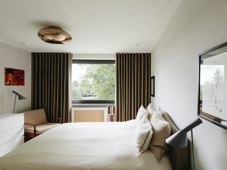 Das Schlafzimmer verkörpert Ruhe und Klarheit. Dezente Farbnuancen, edle Materialien und eine minimalistische Gestaltung schaffen einen Rückzugsort der Entspannung. Von hier aus genießen die Bewohner den Blick auf den beliebten Hamburger Isebekkanal. Das großzügige Fenster öffnet den Raum zur Natur und lässt Licht und Weite in den Mittelpunkt.