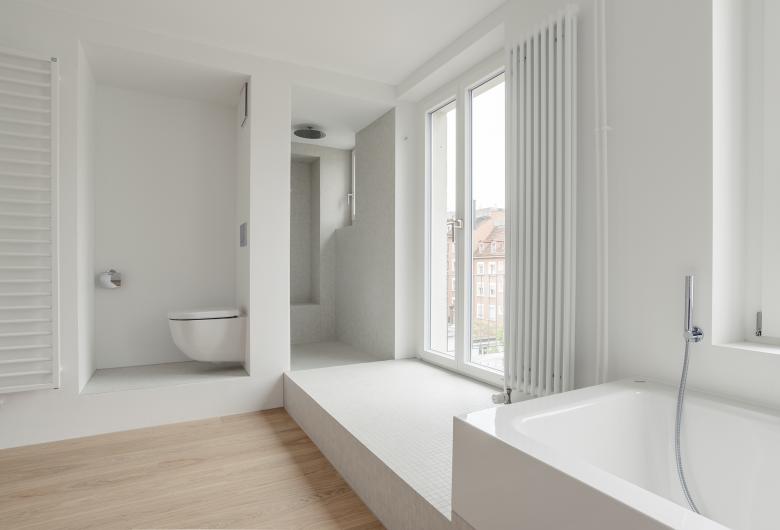Aus zwei separaten Wohnungen in einem Wohnhaus in der Quartiererhaltungszone von Zürich – Aussersihl wird eine Maisonettewohnung mit interner Treppenverbindung. Während sich die Schlafzimmer und Bäder im unteren Geschoss befinden, wird im darüberliegenden Dachgeschoss der offene Wohnbereich mit Küche realisiert. Die neue Disposition der Nassräume erforderte eine vollständig neue Leitungsführung der Sanitärleitungen, welche allesamt in eine bestehende Fallleitung zu münden hatten.