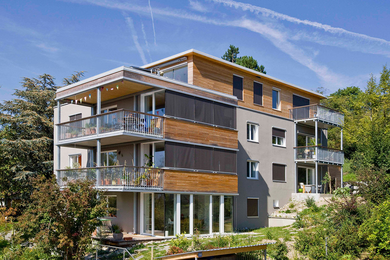 Dieses typische Fünffamilienhaus der Nachkriegsjahre war noch nie renoviert worden. Seit der Sanierung ist es um ein Stockwerk aufgestockt und energetisch mit einem Neubau vergleichbar. Die kleine Ausnützungsreserve erlaubte es, das Wohnzimmer auf heutige Ansprüche zu erweitern und eine Terrasse so gross wie ein zusätzliches Zimmer anzubauen. Dank dem geringen Eigengewicht der Aufstockung in Holz musste die bestehende Bausubstanz nicht ertüchtigt werden.