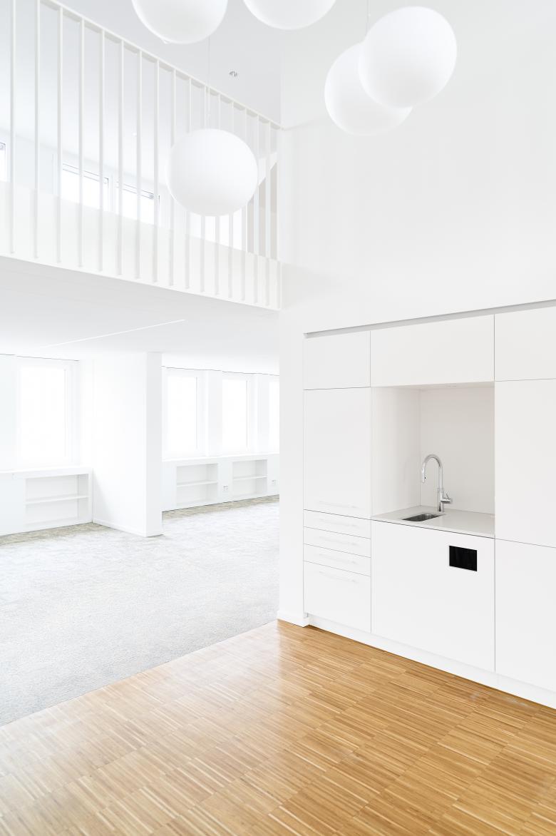 Im Gegensatz zur vorherigen kleinteiligen Raumstruktur sind die Büroflächen heute als offene, grosszügig nutzbare Open-Space-Bereiche konzipiert. Die beiden Bürogeschosse sind durch gezielt gesetzte Deckenausschnitte mit internen Treppen verbunden, die nicht nur der vertikalen Erschliessung, sondern auch der räumlichen Verzahnung und Sichtverbindung dienen. Zusätzlich integrierte Gauben und Dachterrassen führen Tageslicht in den Innenraum und werten die Aufenthaltsqualität im Bürobereich auf.