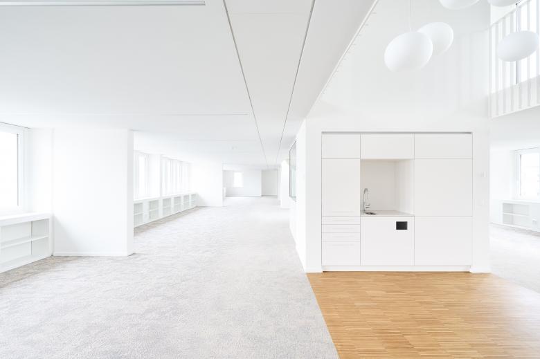 Das Bestreben der Bauherrschaft lag in der Reduktion der bestehenden Büroflächen zugunsten einer ergänzenden Wohnnutzung. Im Zuge der Projektbearbeitung – in enger Zusammenarbeit mit Burckhardt Architekten als Generalplaner – wurde das Gebäude durch gezielte, präzise Eingriffe neu strukturiert. So konnte eine funktionale und räumliche Nutzungsschichtung von Wohnen in den beiden unteren sowie Büro in den darüberliegenden Geschossen innerhalb desselben Baukörpers ermöglicht werden. Die bestehende Raumstruktur wurde rückgebaut, die statische Aussteifung des Gebäudes durch entsprechende Massnahmen ergänzt, und die neue Raumorganisation durch neu eingezogene Innenwände definiert.