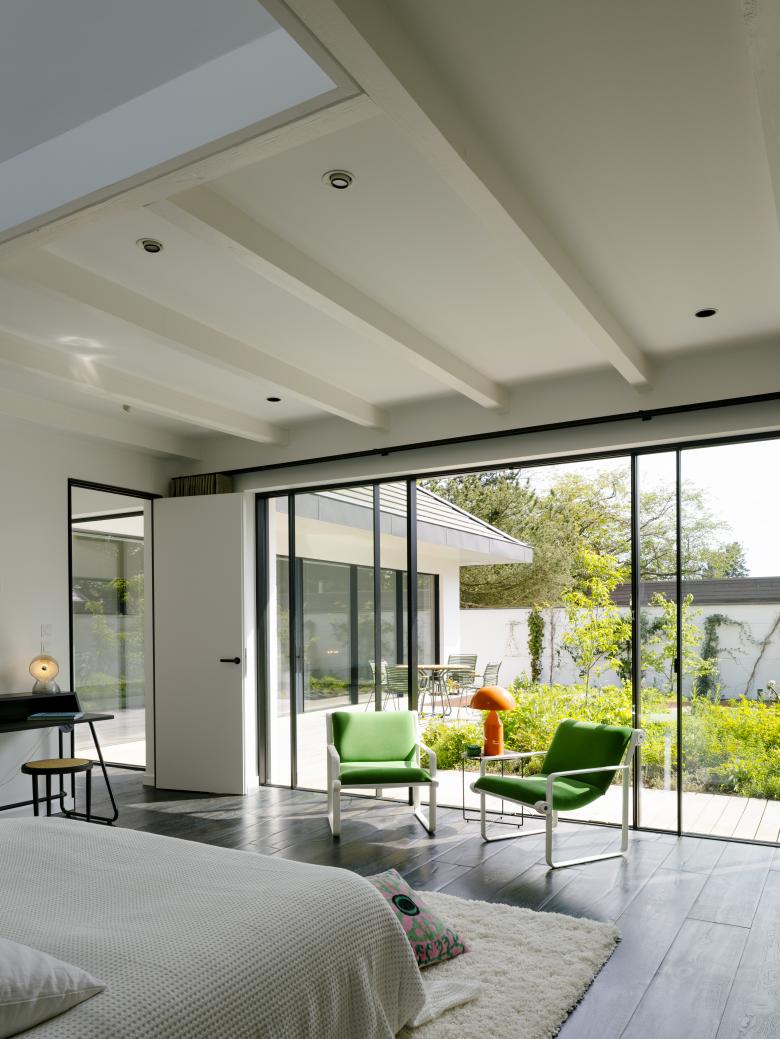Ende 2021 erwarben neue Besitzer das in die Jahre gekommene Haus mit doppeltem Dach und nicht nutzbarem Raum dazwischen. Trotzdem entschieden sie sich, das Gebäude zu erhalten, energetisch zu optimieren und an moderne Standards anzupassen. Bechtloff vereinte das aufgesetzte Dach mit dem ursprünglichen Baukörper zu einer räumlichen Einheit. Er baute es bis auf den Dachstuhl zurück und optimierte es nach heutigem Regelwerk. Im Wohn- und Poolbereich entfernte er das bestehende Flachdach samt Tragkonstruktion, sodass nur der Dachstuhl des geneigten Daches erhalten blieb. In den anderen Bereichen ließ er lediglich die Balken des Flachdaches freilegen. Das Gebäude gewann dadurch seinen besonderen Reiz: Aus der ursprünglichen Deckenhöhe von 2,50 Metern wurden Räume bis zu 6,5 Meter hoch, teils mit geweißter, sichtbarer Dachkonstruktion.