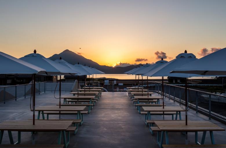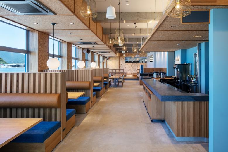 ステンレスも錆びるこの場所の潮風を考慮し、構造はRC造でパラペットを雪止めとして無落雪屋根としている。またRC躯体への断熱を徹底し、開口部を限定することでCASBEEのAランクの評価を得ている。屋上のUMIKARAテラスは、日常的には、観光客はもちろん、地元の方や子どもたちも海・山・集落を見て過ごすことの出来るパブリックな場所でありながら、夏の繁忙期や連休では、高浜町、運営者、地域の有志が、BBQやフェスなど様々なイベントを主体となって開催できる、コモンの場所である。