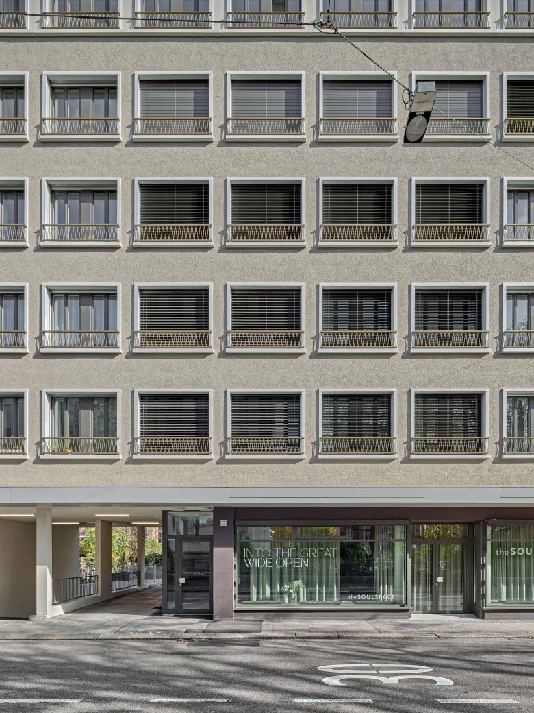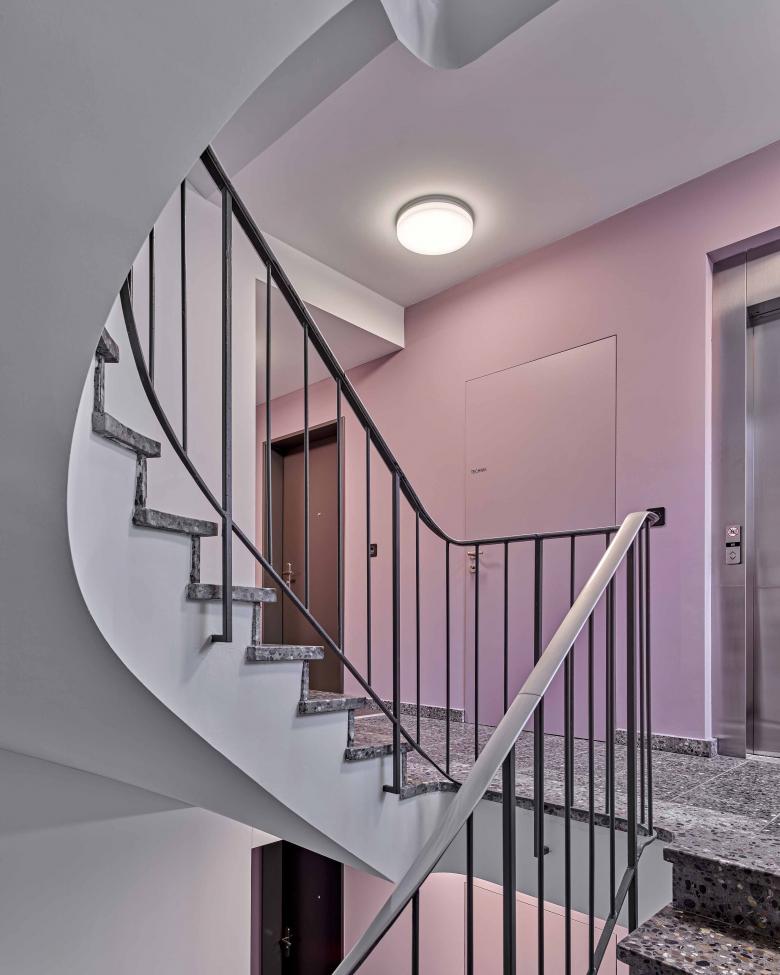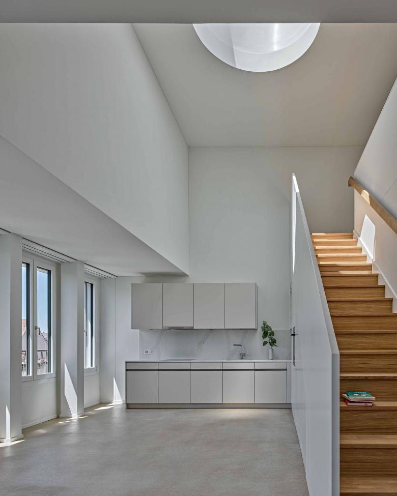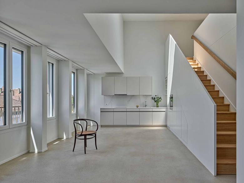 Ebenso erlaubte die dem Bürohaus zugrundeliegende Rasterstruktur mit drei mittigen Stützen eine freie Grundrisseinteilung. Im schönen Bestandstreppenhaus ermöglichte der Versatz einer Wand einen grösseren Lift sowie Flächenoptimierungen, womit der Kern wieder zur Visitenkarte wird. Während das Parterre mit grossen Schaufenstern nun als Yogastudio genutzt wird, sind darüber 15 Wohnungen entstanden. Es galt, dem Raster ein Maximum an gut ausgelegten Räumen abzuringen. Pro Etage gibt es zwei durchgestreckte Wohnungen mit Balkonen und ein Studio-Loft. Gipsständerwände teilen die Räume, die Betonstützen bleiben sichtbar und die Haustechnik wurde über Bäder- und Gangdecken geführt.