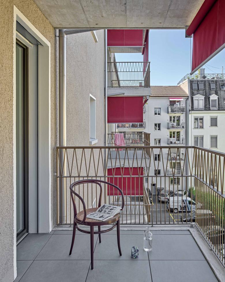 Die obersten zwei Etagen sind zu drei Maisonette-Wohnungen zusammengefasst. Von aussen zeigen sich die neuen Fassaden in zeitloser Gestalt. Dahinter stand lange die Frage, was auf die bestehende Vorhangfassade folgen sollte: Der Entscheid, die Hülle in gleicher Manier zu errichten, führte zu einer Holzelementkonstruktion – und Flächengewinnen. So zeigt sich das einstige Bürohaus an der Strasse in einer wohntypischen Lochfassade, ohne seine Raster-Herkunft zu negieren. Zudem versucht eine visuelle Klammer die obersten zwei Geschosse zu ducken, um zu den tieferen Nachbarn zu vermitteln. Die Hofseite ist mit Einzelfenstern und Balkonen in würdevoller Strenge maskiert. (mc)