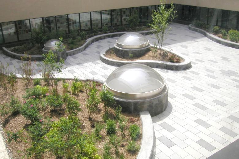UNIS, a K-12 private school, is embarking on a major expansion resulting in the reconfiguration of the outdoor spaces at its unusual campus, a pier in the East River in Manhattan. The master plan by SOM reshapes the ground plane with banded pavement that welcomes visitors at an enlarged entrance off the FDR Drive, sweeps easterly along the parking lot and driveway, continues indoors through a new glass interior courtyard and flows out again to the play area facing the East River. Starr Whitehouse is designing the outdoor portions of this system, including paving; planting beds, green screens along the Waterside Plaza fence and enhancement of existing plantings; and seating. In an initial phase, Starr Whitehouse redesigned the second floor courtyard around new skylights to create a viewing garden that accommodates special assemblies. The biomorphic forms create a dialogue with the rectilinear curtain wall of the light court. Indigenous plantings accentuate the microclimates of sun and shade across the courtyard.