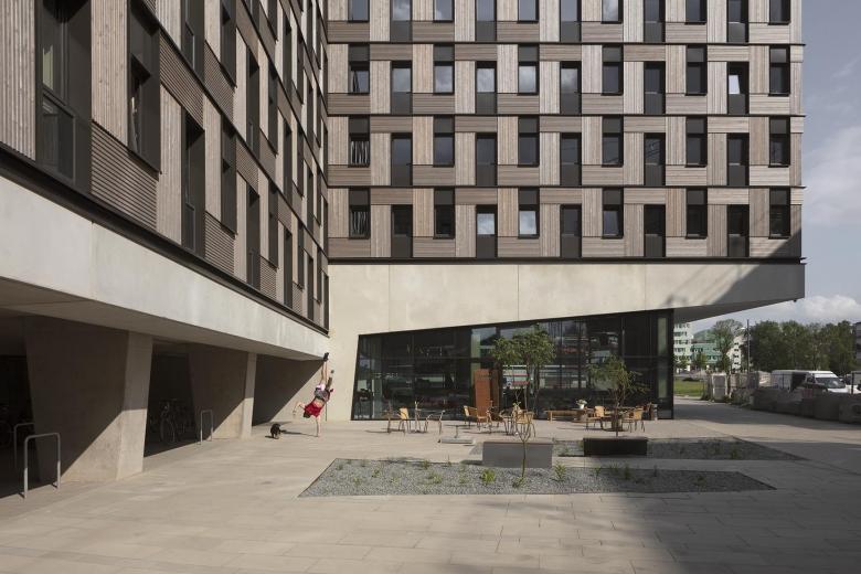 Nutzung und Funktionsverteilung des Wohnheims sind von außen deutlich ablesbar. Das Erdgeschoss und die drei Erschließungskerne sind in konventioneller Stahlbetonbauweise mit einer zweiten Schale aus Sichtbeton ausgeführt. So bildet das EG einen Betontisch, auf dem sich die 371 Wohnmodule zu 5 bzw. 6 Obergeschossen stapeln. Unterhalb der Tischauskragung an den Kernen befinden sich Räume für Gemeinschaft und Gastronomie, die vollverglast sind. Das Luftgeschoss zwischen den Kernen bietet Raum für 400 überdachte Fahrradstellplätze und öffnet den Blick zur Rückseite des Grundstücks.